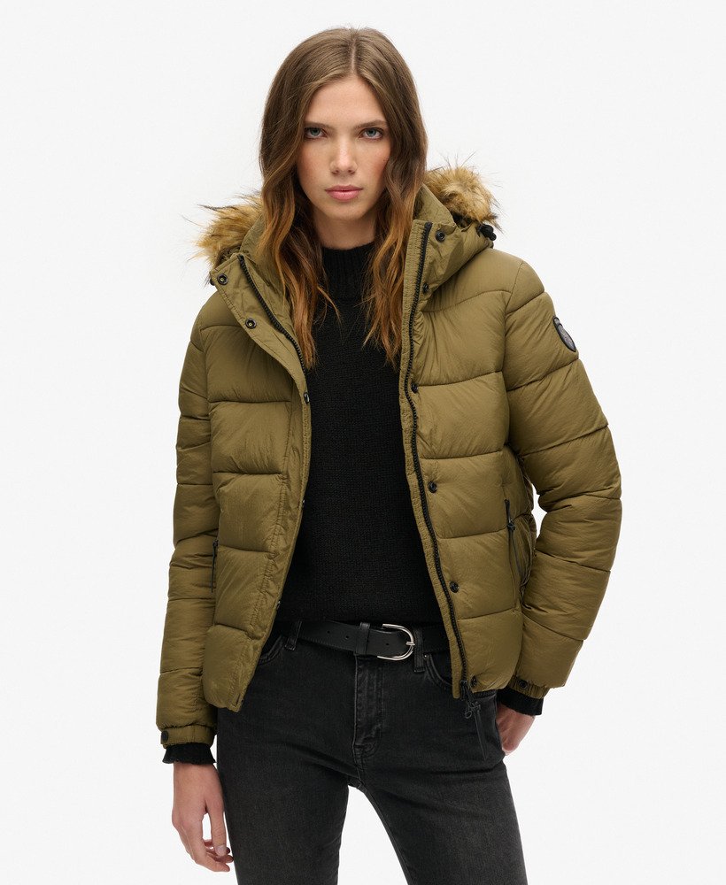 Doudoune courte à capuche avec fausse fourrurekaki camouflage pour Femme | Superdry FR